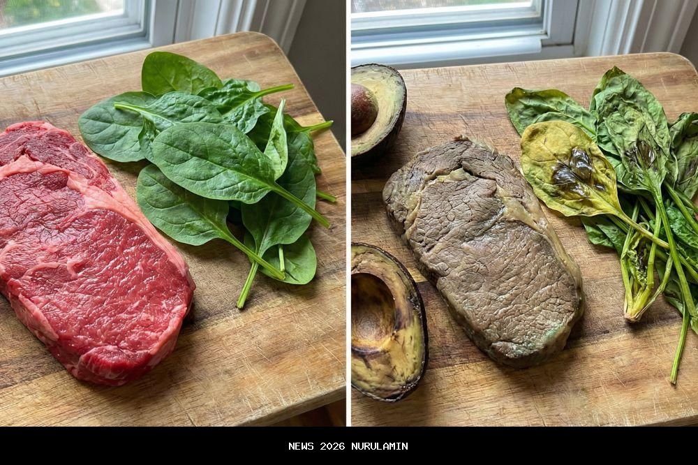 Makanan segar biasanya memiliki warna yang cerah dan alami. Perhatikan jika terjadi perubahan warna yang drastis. Misalnya, daging merah segar yang berubah menjadi kecokelatan kusam, abu-abu, atau kehijauan adalah tanda pasti bahwa daging tersebut sudah rusak.