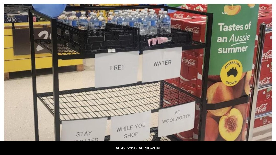 Pada Rabu pekan ini, suhu di Melbourne mencapai 41 derajat Celsius menjadikannya hari terpanas dalam enam tahun terakhir. Di tengah panas yang menyengat itu, pelanggan yang datang ke Woolworths Cranbourne North, di wilayah tenggara Melbourne, disambut dengan kejutan menyenangkan: sebuah troli berisi botol air minum gratis di pintu masuk toko.