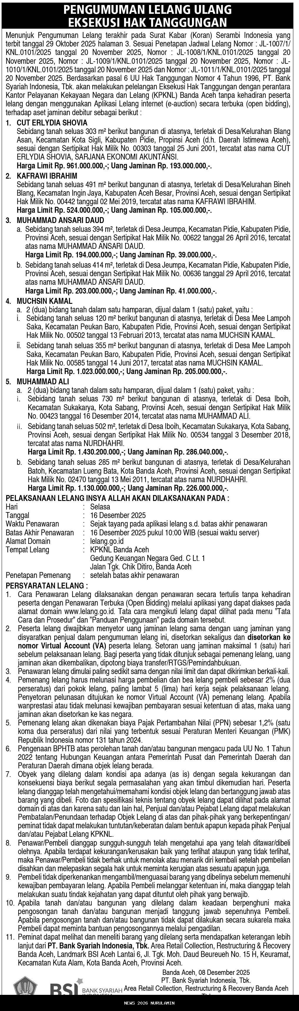 PT. Bank Syariah Indonesia, Tbk. akan melakukan pelelangan eksekusi hak tanggungan dengan perantara Kantor Pelayanan Kekayaan Negara dan Lelang (KPKNL) Banda Aceh tanpa kehadiran peserta lelang dengan menggunakan Aplikasi Lelang Internet (e-auction) secara terbuka (open bidding), terhadap aset jaminan debitur sebagai berikut :