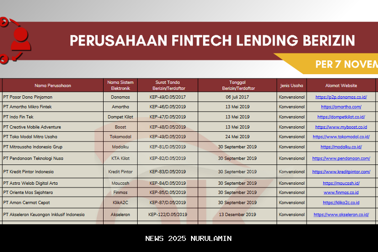 OJK pun rutin memperbarui daftar resmi penyelenggara fintech lending. Per 13 Desember 2025, terdapat 95 pinjol resmi OJK yang masih aktif dan berizin. Sampai dengan 7 Desember, total jumlah penyelenggara LPBBTI/Fintech P2PL yang berizin di OJK adalah sebanyak 95 perusahaan.
