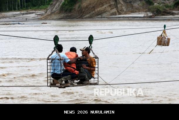 Warga menggunakan kabel baja yang untuk menyeberangi Sungai Juli pascaputusnya Jembatan Juli di jalan lintas Bireuen - Takengon, Aceh. - (ANTARA FOTO/Irwansyah Putra)