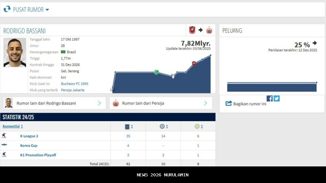 Berdasarkan informasi yang beredar, peluang Rodrigo Bassani untuk bergabung dengan Persija Jakarta diperkirakan sebesar 25 persen. Hal ini didasarkan pada data dari situs Transfermarkt.com, yang menjadi sumber informasi terpercaya bagi banyak klub dan pemain di seluruh dunia.