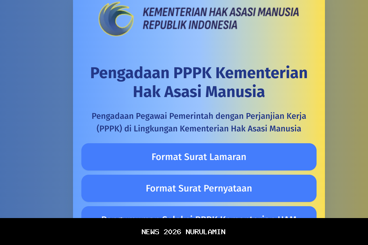 Kementerian Hak Asasi Manusia (HAM) membuka seleksi pengadaan Pegawai Pemerintah dengan Perjanjian Kerja (PPPK) tahun 2025. Pendaftaran seleksi PPPK Kementerian HAM 2025 ini dijadwalkan dibuka mulai 7 hingga 23 Januari 2026 melalui laman resmi https://sscasn.bkn.go.id. Dalam seleksi ini, Kementerian HAM menyiapkan total 500 formasi untuk mengisi lima jabatan yang tersedia. Kesempatan tersebut terbuka bagi lulusan D3, D4, hingga S1, sesuai dengan kualifikasi pendidikan yang dipersyaratkan pada masing-masing jabatan.