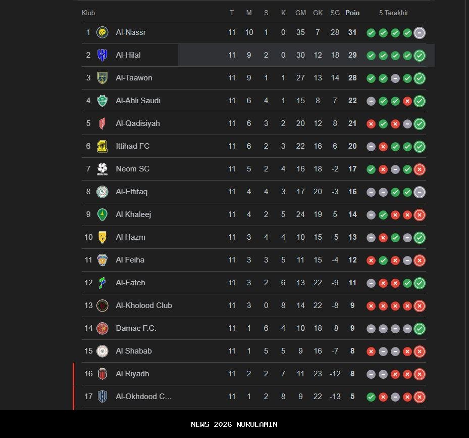 Klasemen Liga Arab Saudi 2025/2026 Setelah Pekan 12