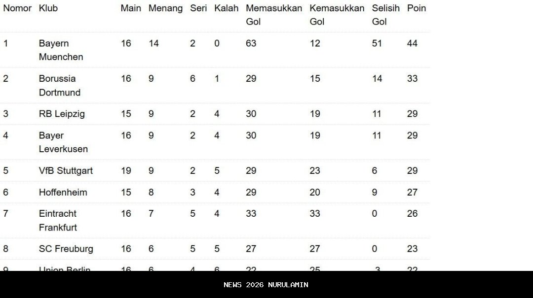 Klasemen sementara pekan ke-16 Bundesliga 2025-2026