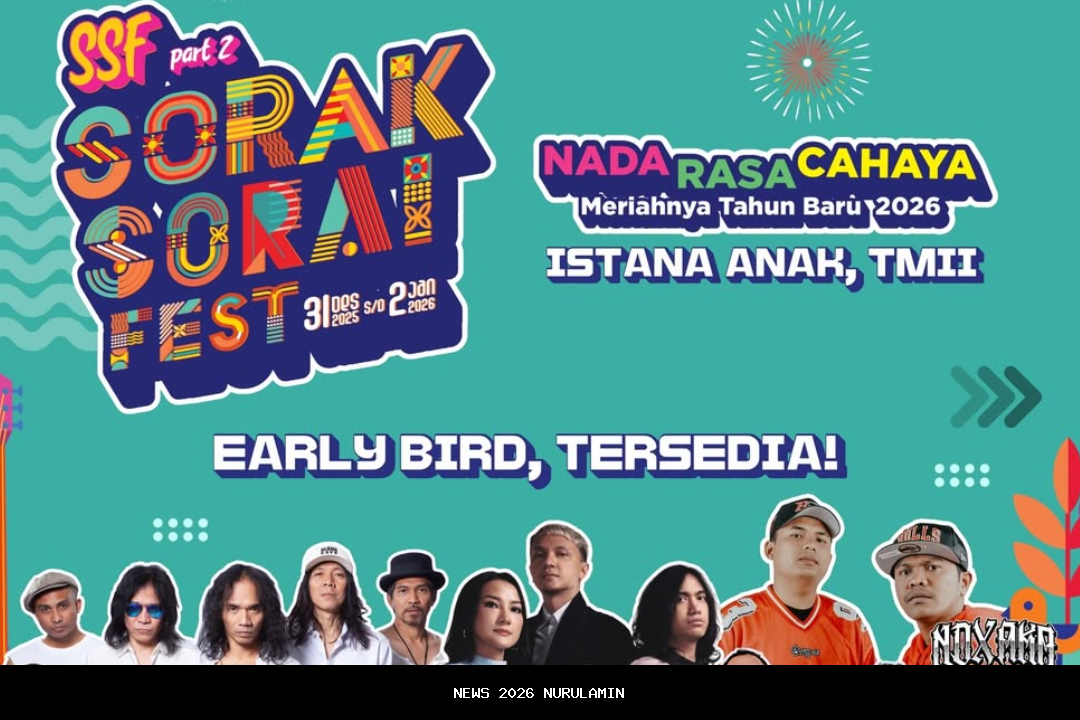 Selanjutnya, ada acara Sorak Sorai Fest yang bisa menjadi pilihan seru untuk merayakan malam Tahun Baru 2026 bersama keluarga. Pasalnya, festival ini akan menampilkan musisi lintas generasi seperti Slank, Barasuara, Vierratale, Tipe-X, NDX AKA, Souljah, Orkes Nunung CS, dan The Soulful.