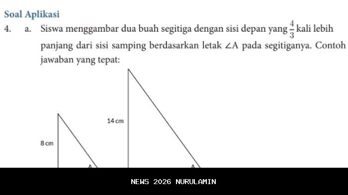 Siswa diminta menggambar segitiga dengan sisi samping yang 4 kali lebih panjang dari sisi depan. Contoh jawaban yang tepat adalah menggambarkan segitiga dengan perbandingan sisi samping terhadap sisi depan sebesar 4:1. Dengan demikian, siswa dapat memahami hubungan antara sudut dan sisi-sisi segitiga.
