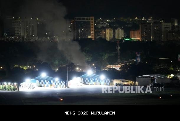 Asap mengepul di bandara La Carlota setelah ledakan dan pesawat terbang rendah terdengar di Caracas, Venezuela, Sabtu, 3 Januari 2026. - (AP Photo/Matias Delacroix)