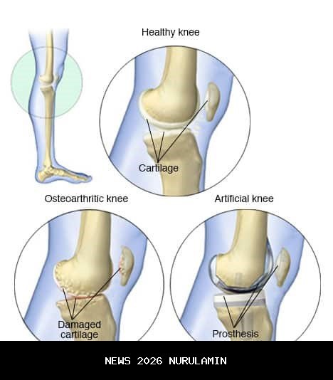 Ilustrasi perbandingan lutut sehat, lutut rusak, dan lutut pasca-ganti sendi