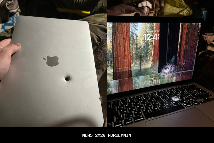 Dari foto yang dibagikan, layar MacBook Air terlihat retak dan berlubang kecil akibat pecahan peluru. Meski demikian, sebagian panel layar masih mampu menampilkan gambar.