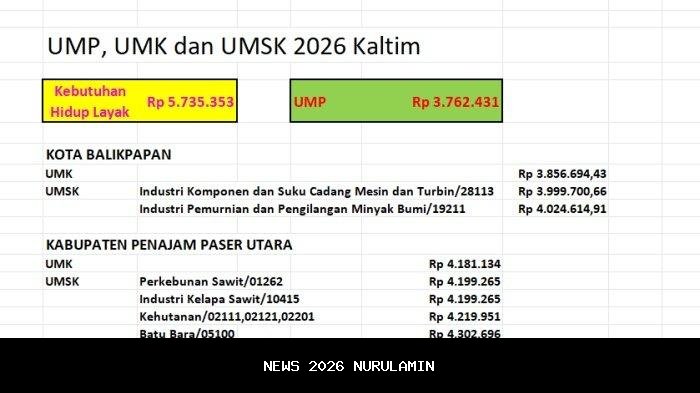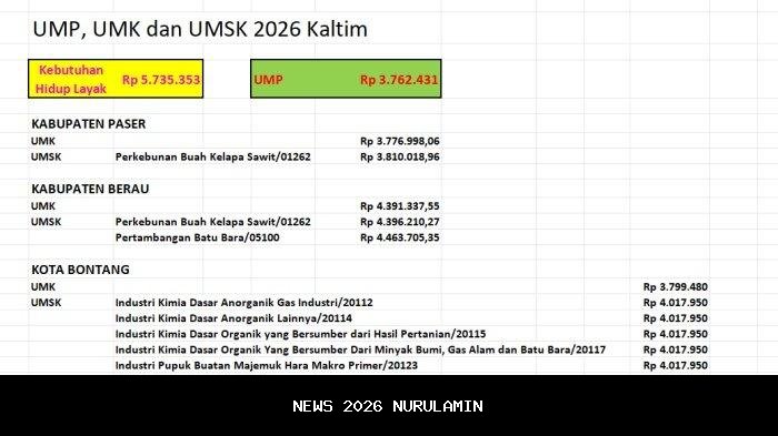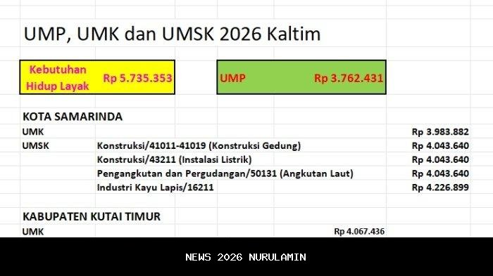 Hari ini, Kamis (01/01/2026), besaran Upah Minimum Provinsi (UMP) serta Upah Minimum Kabupaten/Kota (UMK) dan Upah Minimum Sektor Kabupaten/Kota (UMSK) di Kalimantan Timur (Kaltim) mulai berlaku. Gubernur Kaltim, Rudy Mas'ud telah menetapkan besaran UMP, UMK, dan UMSK 2026 pada Rabu (24/12/2025) lalu. Namun, besaran UMP 2026 Kaltim masih belum mencapai Kebutuhan Hidup Layak (KHL).