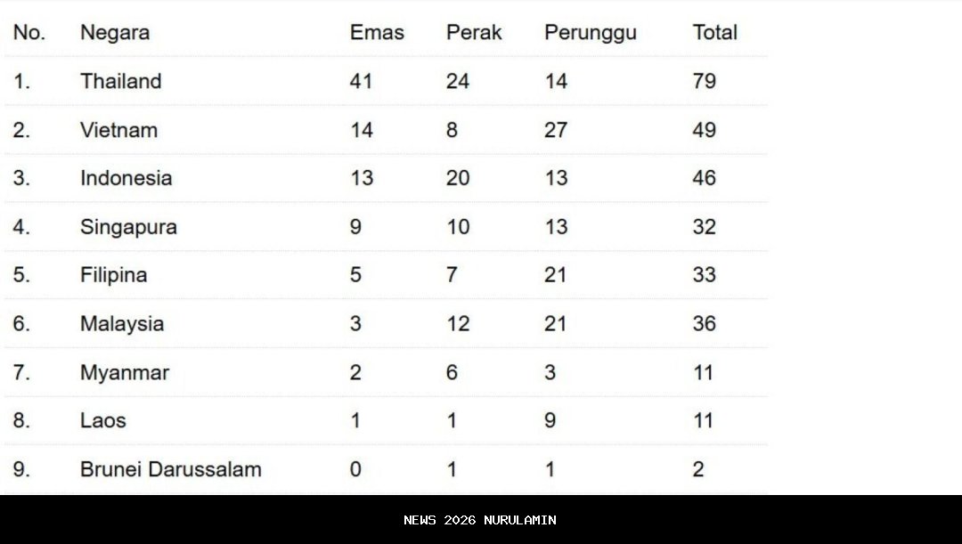 Vietnam, yang sebelumnya berada di urutan keempat, kini naik ke posisi kedua dengan raihan 14 emas, delapan perak, dan 27 perunggu, atau total 49 medali. Sementara itu, tuan rumah Thailand masih kokoh di puncak klasemen dengan 41 emas, 24 perak, dan 14 perunggu, atau total 79 medali.