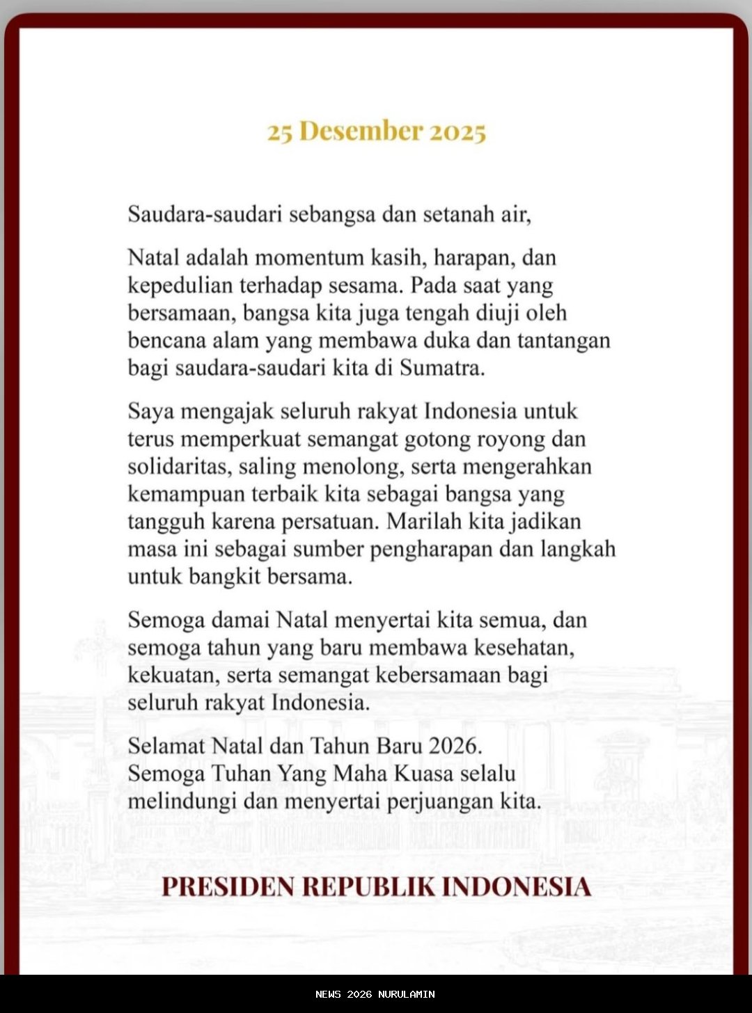Ucapan Natal dan Tahun Baru 2026 dari Presiden Prabowo Subianto