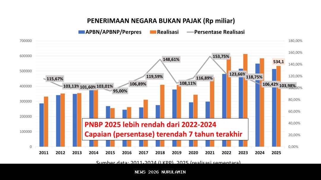 Meski melampaui target, realisasi tersebut secara nominal lebih rendah alias terkontraksi bila dibandingkan PNBP pada 2024 dan bahkan sejak 2022. Persentase capaian di atas target PNBP 2025 pun bahkan terendah dalam tujuh tahun terakhir.