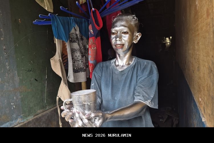 - Di depan puluhan kontrakan semipermanen yang berada tepat di samping rel kereta api Kampung Bahari, Tanjung Priok, Jakarta Utara, belasan orang bersiap-siap untuk mewarnai tubuhnya dengan cat berwarna silver, setiap pagi.