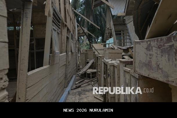 Bangunan yang rusak diterjang banjir bandang di Pondok Pesantren Islam Terpadu Al Hidayah, Desa Sidodadi, Aceh Tamiang, Aceh, Kamis (25/12/2025). Sebanyak 60 persen bangunan di pondok pesantren tersebut hancur meliputi bangunan asrama, ruang kelas dan fasilitas belajar mengajar. Menurut pengurus pesantren, aktivitas belajar mengajar akan kembali normal pada pertengahan bulan Januari mendatang dengan menggunakan gedung mushola dan ruang guru.