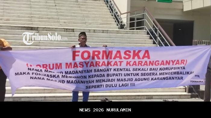 Sejumlah warga Karanganyar menggelar aksi singkat di halaman Masjid Agung Madaniyah. Aksi ini dilakukan usai salat Jumat, Jumat (12/12/2025), dengan tujuan meminta pengembalian nama masjid ke bentuk aslinya, yaitu Masjid Agung Karanganyar.