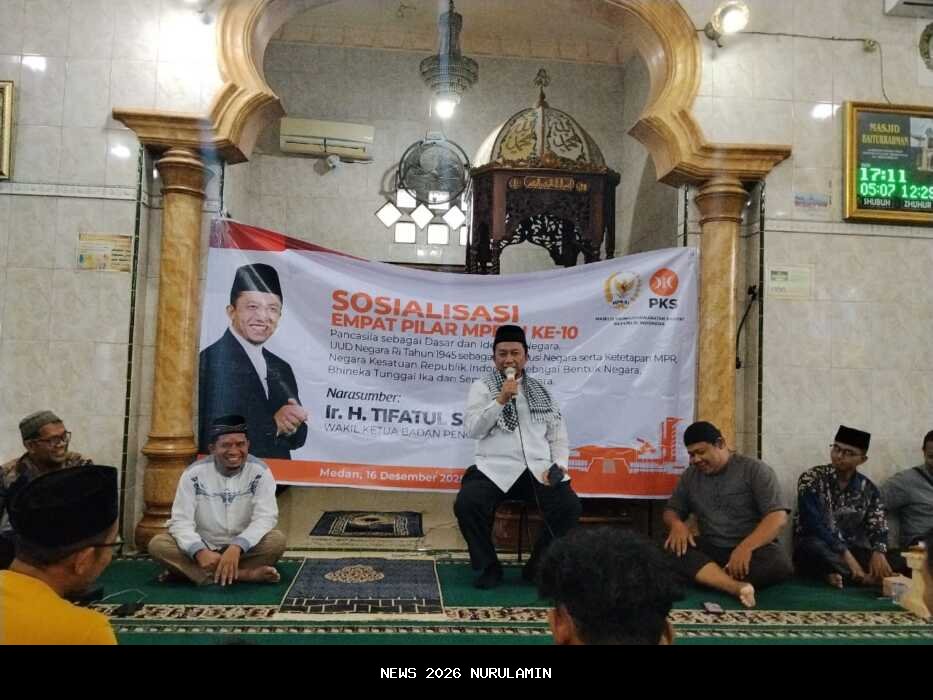 MEDAN, nurulamin.pro.co – Anggota DPR RI dari Fraksi PKS, Ir H Tifatul Sembiring, kembali menggelar kegiatan sosialisasi tentang 4 Pilar MPR RI. Kali ini, ia menyambangi konstituennya di Jalan Rengas VI, Medan Marelan, pada hari Selasa (16/12). Sosialisasi ini digelar di Aula Masjid Baiturahman dan dihadiri oleh para peserta yang berasal dari berbagai kalangan masyarakat.