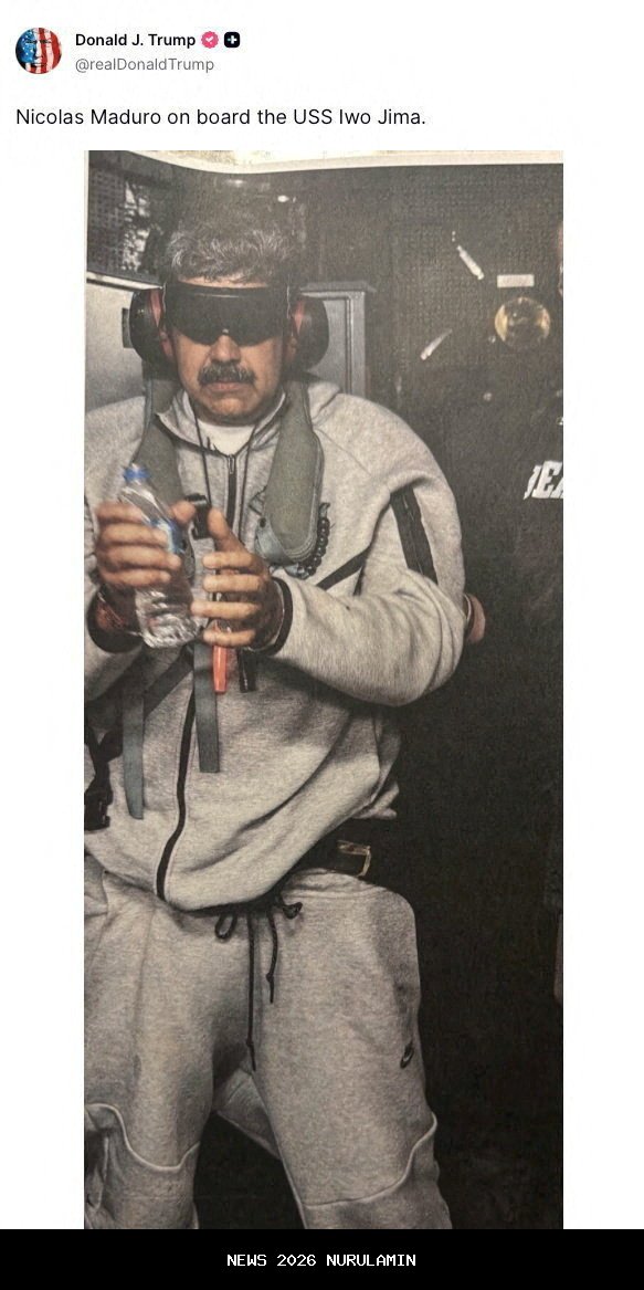 Presiden Amerika Serikat (AS) Donald Trump mengunggah foto Presiden Venezuela Nicolas Maduro yang baru saja ditangkap oleh pasukan elite AS. Foto Maduro itu diunggah di akun sosial media Truth milik Trump.