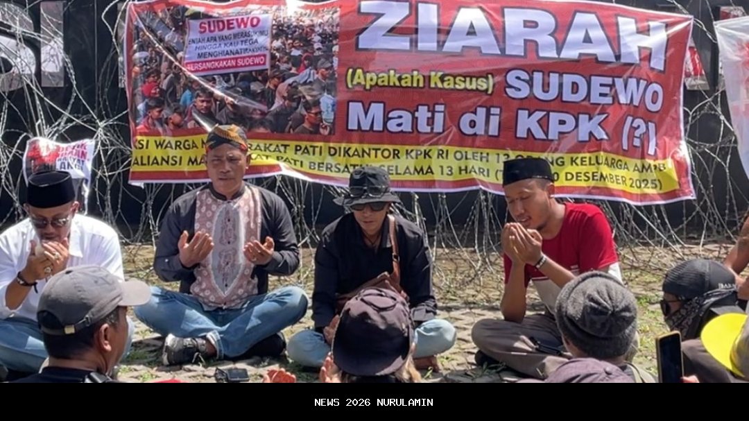 Warga yang tergabung dalam Aliansi Masyarakat Pati Bersatu (AMPB) menggelar doa bersama dan aksi damai di depan Gedung Merah Putih Komisi Pemberantasan Korupsi (KPK), Senin 8 Desember 2025. Mereka datang jauh-jauh dari Pati untuk menanyakan perkembangan proses hukum Bupati Pati, Sudewo, dalam kasus dugaan korupsi proyek pembangunan jalur kereta api wilayah Jawa Tengah pada Direktorat Jenderal Perkeretaapian (DJKA) Kementerian Perhubungan tahun anggaran 2018–2022.